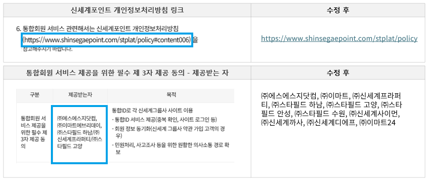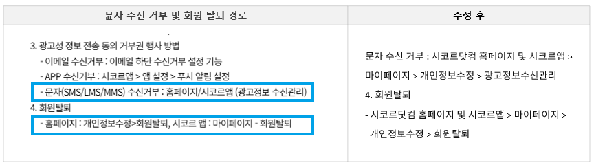 안녕하세요, 시코르닷컴입니다. 2025년 12월 15일부로 시코르닷컴 개인정보처리방침이 개정되어 아래와 같이 안내해 드립니다. 1. 개정사유: 개인정보보호법 강화에 따른 개인정보 처리방침 현행화 2. 개정 내용 [제2조 수집하는 개인정보 항목 및 방법] [제3조 개인정보 제공 및 공유] 신세계 그룹사 편의서비스 제공을 위한 개인정보 제3자 제공 동의 - 삭제 내용 수정 [제6조 개인정보 열람, 정정 탈퇴 및 동의 철회 방법] |