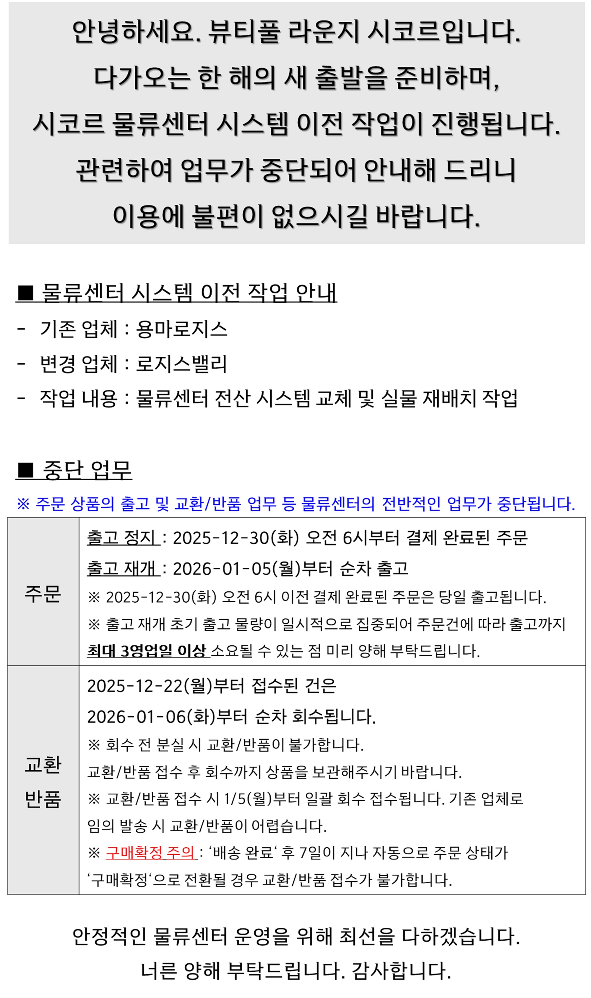 안녕하세요. 뷰티풀 라운지 시코르입니다. 보다 안정적인 서비스 제공을 위해 아래와 같이 시스템 작업이 진행될 예정입니다. 작업 시간 중 모든 서비스가 중단되오니 이용에 참고 부탁드립니다. ■ 작업일시 : 2026-01-05(월) 00:00~05:00(5시간) ■ 작업내용 : 시코르 물류센터 시스템 아전 관련 ■ 작업 영향도 : 점검시간 중 시코르닷컴 사이트 이용 불가 예정된 시간 내 작업이 완료될 수 있도록 최선을 다하겠습니다. 너른 양해 부탁드립니다. |