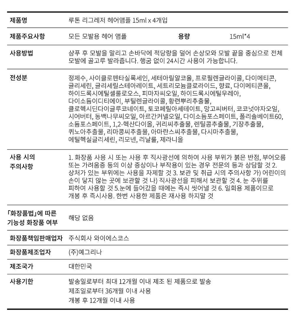 리그레저 헤어앰플 고농축 노워시 트리트먼트 15ml x 4개입(극손상모)