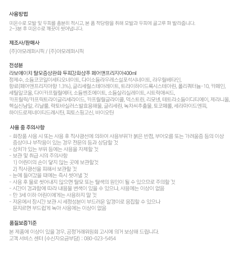 [퍼퓸샴푸] 라보에이치 탈모증상완화 샴푸 두피강화 페어앤프리지아 400ml