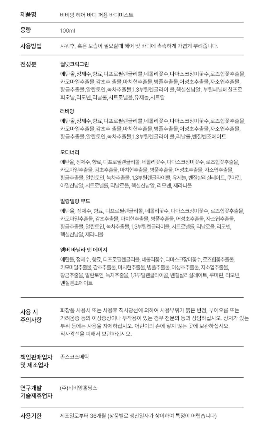 [보이넥스트도어 PICK] 비비앙 헤어 바디 퍼퓸 미스트 100ml 4종
